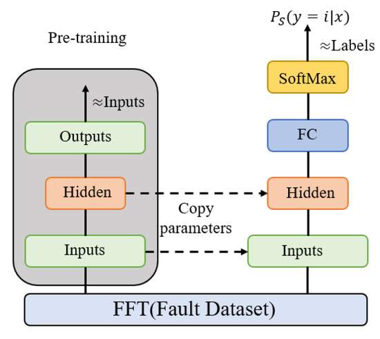 After pre-training, the parameters of the input and hidden layers are copied to the classifier, and the total loss function of the classifier is given by the output of the fully connected and SoftMax layers, as shown in Figure 3. In addition, the cross-entropy loss function is shown as: