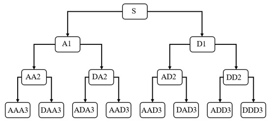 Figure 4 shows the schematic of the three-layer wavelet decomposition. In the figure, A represents the approximation filtering, which can extract the low frequency part of the previous decomposition; D represents the detailed filtering, which can extract the high frequency part of the previous decomposition. The frequency and intensity of the vibration received by the FOG are different due to the different degrees of abrupt change at fault. Thus, the db10 wavelet of the Daubechies wavelet family with good symmetry and regularity is chosen to carry out a seven-layer decomposition. It can better extract the characteristics of the FOG output signal in each frequency band.
