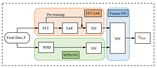 As shown in Figure 6, the two basic classifiers in this paper are FFT-based SAE and WPD-based NN. We divided the training data into basic training data and fusion training data. Firstly, the two base classifiers were trained with the basic training data. After the training was completed, the fusion training data were spliced by the 6-class output probabilities of the base classifiers to obtain the 12-dimensional data for fusion training. The fusion classifier was trained with these data to obtain the complete fusion model parameters. The parameters of each of these classifiers are listed in the Table 1.