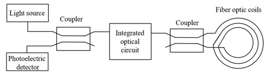 In order to establish the mathematical model of FOG, the physical model needs to be studied first. The subject of the interferometric FOG is a Sagnac interferometer, which consists of a light source, coupler, light detector, integrated optical circuit, and fiber optic coil, shown as Figure 7. The light from the light source is directed into the fiber coil from the opposite direction, and, due to the Sagnac effect, when the two beams are reunited at the origin, we can measure the differential phase shift, and calculate the velocity based on the interference effect produced by the two beams [24].