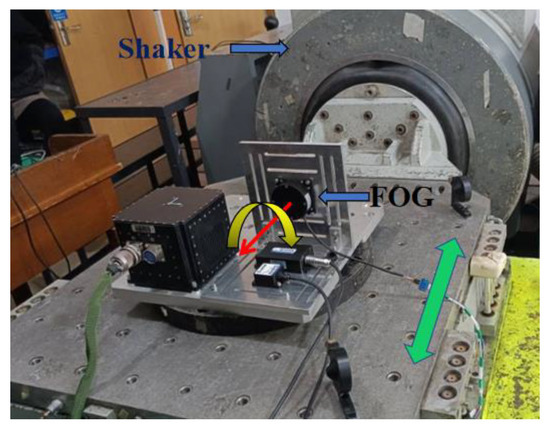 Experimental conditions of FOG. The green arrow represents the vibration direction of the shaker; the yellow arrow represents the positive direction of the angular velocity measured by the FOG.