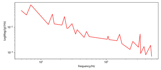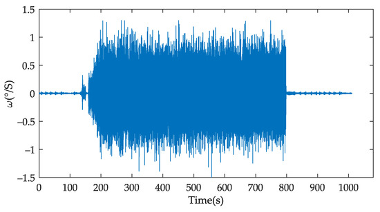 The experiment was arranged as shown in Figure 8, with the FOG placed on the shaker, and the shaker vibrating horizontally. The national military standard vibration test standard GJB150.16A-2009 Schedule C.7 vibration spectrum was used to simulate random vibration, and the frequency spectrum is shown in Figure 9. Frequency spectrum specific inflection point data can be found in Appendix A Table A1. The sampling frequency of the FOG was 100 HZ, vibration time was 600 s, and a total of 1080 s data was collected. The output curve of FOG angular velocity is shown in Figure 10.