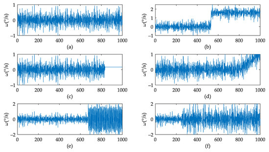 Multiplicative fault: The output signal of the FOG is multiplied by a constant from a certain point onwards due to a drastic change in the FOG scale factor, which is in turn caused by a drastic change in the operating environment. The mathematical model is shown in Equation (17), where is the multiplier factor, and random range is .The generated fault data are shown in Figure 11f.
