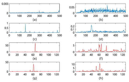 Fault diagnosis is a process in which the diagnostic model effectively distinguishes signals of different fault types, but the interference of vibration increases this difficulty. Figure 12a,b show the normal signal FFT processing in stationary and vibration states, respectively. Figure 12c,d show the fault signal (periodic disturbance fault) FFT processing in stationary and vibration states, respectively; Figure 12e–h show the WPD processing of the same condition with (a–d). From the figures, it can be seen that vibration is disturbing for the diagnosis of the fault classes.