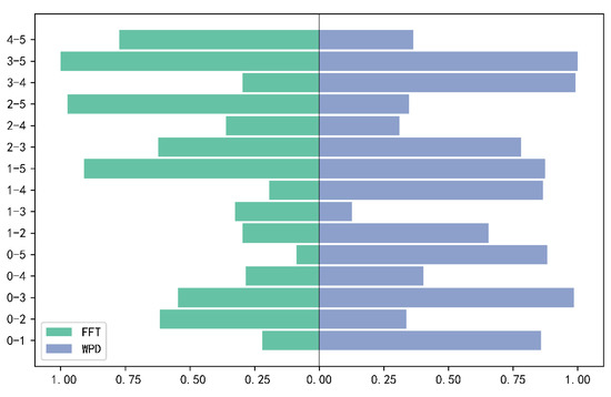 Figure 13 shows the normalized Wasserstein distance between different fault classes after FFT and WPD processing, with ‘0–1’ representing the Wasserstein distance between class 0 and class 1, a symmetric value with 1–0. After the two processing methods, ‘0–5’ and ‘1–3’ are the smallest, respectively. This is the same as the difference between two basic classifiers diagnosed in the subsequent experimental validation. The two processing methods have different focuses for the same two classes, which indicates, to a certain degree, that the two methods have the complementary possibilities.