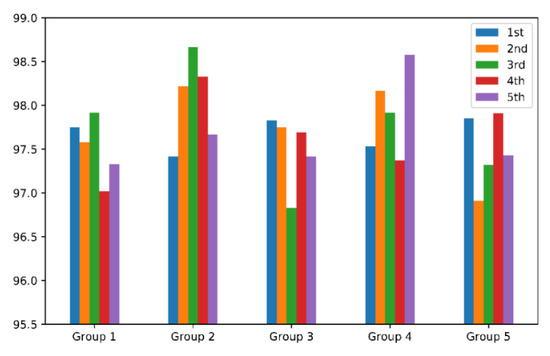 In Figure 15, five experiments were conducted in each group, and the average accuracy and standard deviation of each group were 97.52 0.35%; 97.73 0.53%; 97.5 0.40%; 97.91 0.49%; and 97.48 0.41%, respectively. The overall average accuracy was 97.63%, which was similar in each group; the standard deviation between groups was 0.19%, which was smaller than the standard deviation within each group. It indicates that the accuracy is little affected by the group and sample, and the model is relatively stable.
