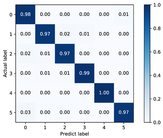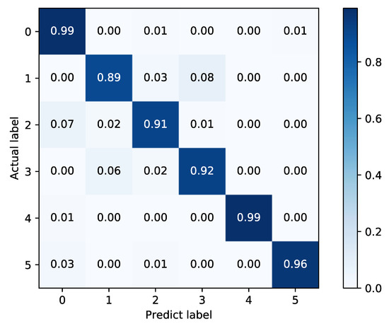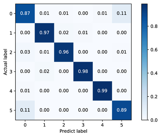 In Figure 16 and Figure 17, it can be found that the FFT + SAE classifier has a larger misclassification rate in labels 0 and 5, while 1 and 3 are classified more accurately, which is exactly the opposite in the WPD + NN classifier. Therefore, the combination of these two complementary methods can be more effective for fault diagnosis, as shown in Figure 18.