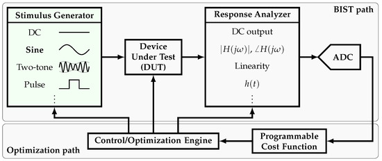 The semiconductor industry has evolved significantly since its creation in the 1950s. Nowadays, testing has proven to be a decisive stage of the production flow. However, testing can consume as much as 55% of the production cost [1]. Consequently, adding on-chip, self-testing capabilities to the Device-Under-Test (DUT), provided by signal generators and response analyzers, has become a practical solution known as the Built-In Self-Test (BIST) approach. In order to make this an efficient solution, the required circuitry must be small in area and consume low power relative to the DUT. A block diagram of a BIST system and the complementary optimization system is shown in Figure 1. The BIST system consists of the stimulus generator, the response analyzer, and an Analog-to-Digital converter (ADC). In order to characterize the DUT, several stimuli can be made available, such as sine wave (single-tone) generators [2,3,4,5,6,7,8,9,10,11,12,13,14,15], two-tone generators [16,17], etc. Complementarily, in order to study the DUT response, several on-chip analyzers have been proposed such as spectrum analyzers [18,19,20,21], linearity analyzers [22,23,24], etc. Based on the BIST path output, the optimization path is able to take a decision and feed back the corresponding tuning signals into the BIST path.