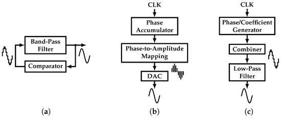 Different approaches to tackle this challenge have been proposed. As presented in [3,4], a low-distortion, single-tone signal can be synthesized by a band-pass filter (BPF) in positive feedback with a multi-level comparator block, as shown in Figure 2a. Unfortunately, the output’s THD is directly proportional to the quality factor of the BPF and complexity of the comparator. This translates into a power hungry, large area filter. In addition, the BPF suffers from a limited frequency tuning range. In addition, the multi-level comparator is sensitive to process variations, introducing more distortion sources.