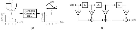 Harmonic-Canceling Filter: (a) Main concept and (b) a generic block diagram.