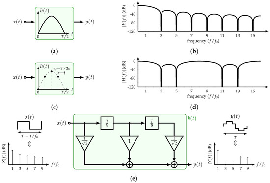 Recent publications have proposed practical implementations of this type of filters that used sampled versions of the half-sine impulse response [11,12,13,14,15,16]. If n samples of the impulse response are taken every , the filter is able to suppress all the input’s odd harmonics except those located at for . Every sample corresponds to a tap coefficient expressed as