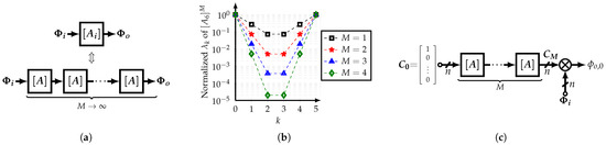Therefore, a cascade of M normalized, even-order n, integer-coefficient SCMs can be used to approximate an irrational-coefficient SCM , as shown in Figure 6a. In addition, Figure 6b shows the eigenvalues of the resultant SCM for different values of M and . Note that the intermediate eigenvalues decrease as M increases. In other words, these intermediate eigenvalues can be considered as the error of the integer-coefficient SCM. It is important to note that the reason for using normalized matrices is that the outputs are bounded to the absolute magnitude of the input phases.