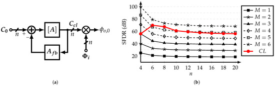 In order to compare the performance of the multi-stage open-loop and single-stage closed-loop approaches, the spurious-free dynamic range (SFDR) of the filter’s output is evaluated using a system-level model. The SFDR is calculated as the ratio of the power of the fundamental frequency and the strongest cancelable harmonic up to the -th harmonic. Figure 7b shows the values of SFDR for different n-tap SCM-based HCFs using M open-stages and the closed-loop approach. It is observed that the closed-loop coefficient generator with is capable of achieving similar SFDR values as a 5-stage open-loop CG for . Thus, the closed-loop CG with a non-ideal norm represents a less complex solution in comparison with the straightforward M-stage open-loop CG approach.