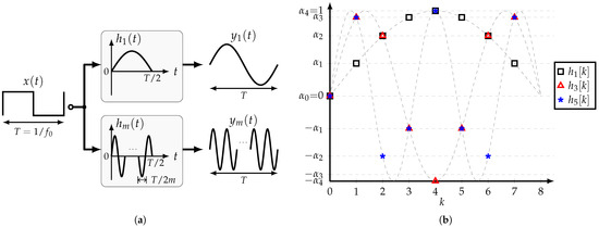 The main concept behind this type of filter is the rejection of the harmonics of a specific input signal in order to obtain a highly pure sine wave at its output; hence, they can be used as single-tone generators. Due to their frequency behavior, digital nature, and not very complex implementation, square waves (SWs) are considered as the filter’s input in this work. Figure 3a presents the operation of an ideal HCF when it is driven by a 50% duty cycle SW with fundamental angular frequency . The ideal output corresponds to a pure single-tone signal with period . Based on the Fourier series theory, any periodic signal can be expressed as