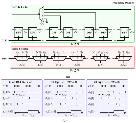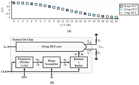 In this work, a reconfigurable, SCM-based, 24-tap HCF is implemented. This filter is able to cancel up to the 47th harmonic of the SW signal with frequency . In other words, this HCF is used as a single-tone generator that produces a stepwise sine-wave differential current signal with frequency . Figure 10a shows its impulse response , which corresponds to a cosine function . It is noted that the coefficients related to , and , correspond to the 12-tap, and 6-tap HCFs, respectively. Thus, by selecting specific phases, the 24-tap, 12-tap, and 6-tap HCFs are available. This feature allows to extend the maximum frequency of the output signal to .