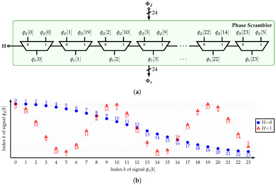 Figure 12a shows the implementation of the phase scrambler (PS). Depending on the value of , the fundamental frequency or the 5th harmonic of are bypassed to the filter’s output, respectively. Note that 5 is coprime with for the three available HCFs. Then, it is true that the tap coefficients of the bandpass HCF are similar to those of the low-pass HCF but with a different order and sign. Figure 12b presents the input-to-output connections.
