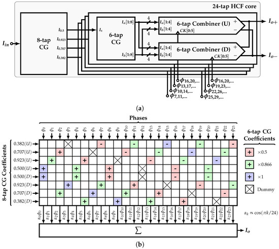 Figure 10b shows the block diagram of the complete system, which is divided in four main blocks: the frequency divider, the phase scrambler, the retimer and buffer, and the 24-tap HCF core. The frequency divider generates the 24 equally-spaced phases from a clock signal with programmable frequency division ratios in order to select between the 24-tap, 12-tap, and 6-tap HCFs. The phase scrambler allows for the rearrangement of the phases such that it can bypass the fundamental or the 5th input’s harmonic to its output. The 24-tap HCF core is divided in the CG and combiner. In order to achieve the required SCM order, 8-tap and 5-tap SCM-based CGs are used in cascade. All the required coefficients are generated using only one input DC current . By means of a combiner, the system produces the differential output current , which is converted to voltage by the load resistors . Each block is presented in detail in the next subsections.