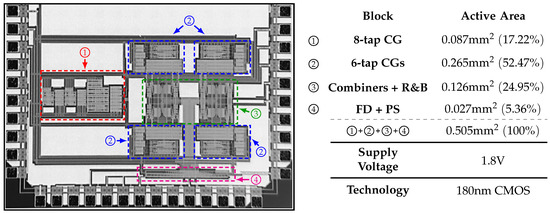 where is the maximum output frequency, is the highest measured SFDR, AF is the number of available filters, FNCH is the first non-cancelable harmonic, is the maximum total power consumption, and A is the area. This FoM is based on the one used by [13,14] with the addition that it accounts for the programmability and the harmonic-canceling range of the system. In this fashion, the number of implemented HCFs in the same area, i.e., the system’s area efficiency, is included in the FoM. On the other hand, recall that an external LPF is still required at the output of the HC-based generators due to the presence of the non-cancelable harmonics at . The order (and therefore, the complexity and power consumption) of the required external LPF is inversely proportional to the order n of the HCF. For this reason, it is relevant to include the FNCH in the FoM.
