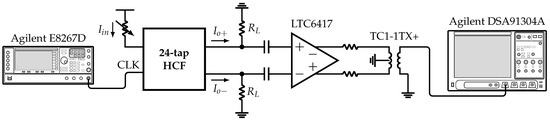 As presented in Section 4, the system incorporates six HCFs, which are selectable based on the value of the inputs and . The former selects between the 6-tap, 12-tap, or 24-tap HCFs, and the latter selects between the fundamental or 5th harmonic of the SW signal with frequency . Figure 16 shows the measurement setup. The clock signal with frequency is provided by an Agilent E8267D vector signal generator. The input current is set by a variable resistor. The differential output current is converted to voltage by the off-chip load resistors . Next, this signal is buffered and converted to single-ended by the LTC6417 and TC1-1TX+, respectively. Finally, the resulting signal is analyzed using the Agilent DSA91304A Infiniium digital signal analyzer.