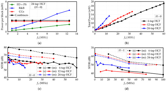 Figure 17a shows the measured power consumption of each block versus the output frequency of the 24-tap HCF when the fundamental frequency of , , is of interest or . Since the CGs only carry DC currents, its power consumption is independent of frequency. Furthermore, these currents are fed to the unit combiners, which steer them according to the pattern shown in Figure 13; hence, the combiner’s power consumption is also constant. Due to their digital nature, the FD, PS, and R&B blocks consume power proportional to the output frequency. In addition, Figure 17b shows the total power consumption of the 6-tap, 12-tap, and 24-tap HCFs versus the output frequency when . These results show that the slopes of the curves are proportional to the filter’s order. This difference is mainly dictated by the fully digital blocks FD, PS, and R&B, especially the former, which enables only the required n DFFs.