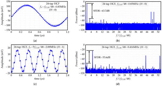 Figure 18a,b show the output’s waveform and power spectral density (PSD) of the 24-tap HCF, respectively, when . The obtained staircase sine-wave waveform presents the first pair of non-cancelable harmonics at and , which can be suppresed with a low-order passive LPF [12,13,15]. In addition, Figure 18c,d show the output’s waveform and PSD of the 24-tap HCF, respectively, when . The first pair of non-cancelable harmonics is located at and . Note that the carrier is located at .