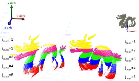 Given two input models, namely the source (S) and the target (T) models, respectively, -sized and -sized point-clouds, partitioning is the operation of grouping the points comprised by each of them into smaller sets, amounting to groups, hereafter called subclouds and indexed by letter j. The grouping occurs by means of a cross-sectioning of the given cloud and k planes along a principal axis, -axis (which can be x, y or z-axis). This is illustrated in Figure 1 for the Dragon model cut along the y-axis.
