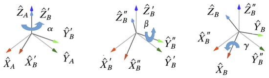 The concept is illustrated in Figure 2. Essentially, from a frame A, representing the original pose of the input model, a micro-misaligned frame B can be obtained if small rotations are applied successively around the principal axes. In the example illustrated, it starts with a rotation around Z by an angle , thus giving rise to intermediate frame , then around Y by , giving rise to intermediate frame , and finally around X by , leading to the final frame B.