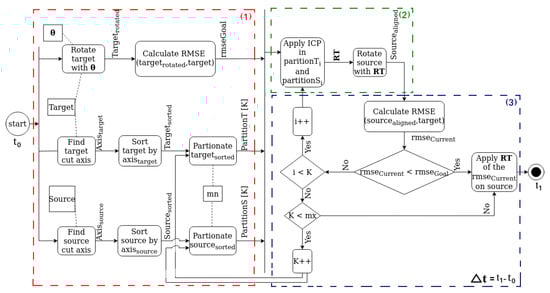 The algorithm starts by dividing each input cloud (source and target) into subclouds. Then, these subclouds are iteratively subjected to pairwise ICP registration, which results in an orientation matrix. Pose correction of the original (entire) point clouds is then assessed from the matrix obtained and from a quantity check, which works as a stop criterion. These steps are discussed further in the following subsections.