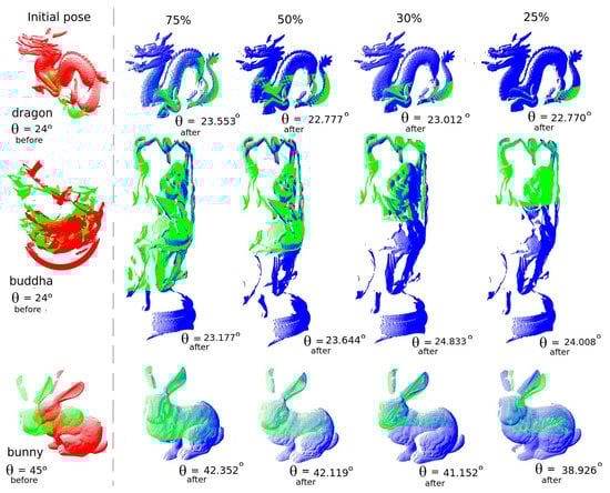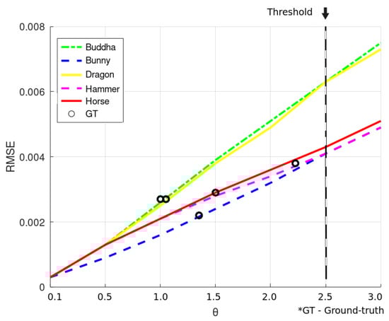 To allow for future validation of the proposed technique, a few notes regarding its main configuration parameters are worth noting. The misalignment, , gives the algorithm the ability to set the quality of pose correction as flexible as the application requires; they were analyzed, in preliminary tests on Happy Buddha, Dragon, Horse and Hammer models the effects of making the criterion as rigid as = 0.1, as well as its route towards larger values until = 3.0. For those models, Figure 4 plots the trend between the micromisalignment angle and the corresponding RMSE calculated from the cloud and its micro misaligned copy. The picture also shows, with circle markers, the RMSE calculated from source and target clouds when the ground truth is applied for pose correction. One can see that = 2.5 is the lower limit for the entire set of models and is imposed by the Hammer model. Trying to force an even shorter angle would make the algorithm to get stuck, since not even the pose alignment according to the ground truth is able to give the corresponding small RMSE. In other words, it gives the closest RMSE to the ground truth achievable by an intentional micromisalignment.