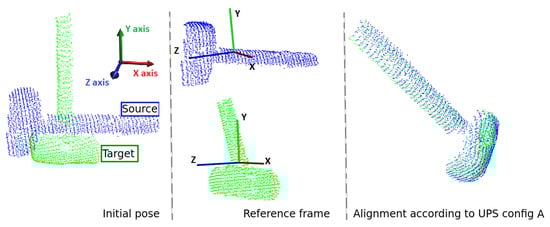 - Configuration B: Here, data variance is calculated only in the target point cloud and the chosen -axis is assigned to both input models, performing faster than the previous one for obvious reasons. It might be a good choice for situations in which the ground truth is known, as well as for registration of sequentially acquired shots in which orientation changes only in one degree of freedom (for example, in-plane robot navigation in SLAM applications []).