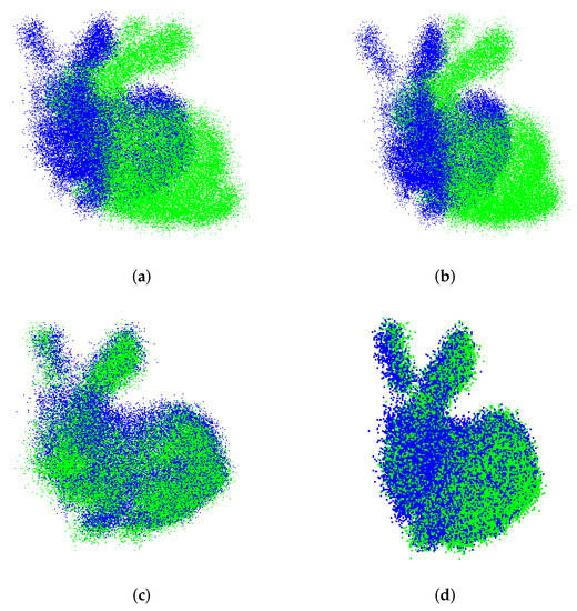 In comparison to the traditional ICP as well as to its variants [,] assessed in this work, the improvement achieved in registration quality may accept two explanations: first, the space of subclouds can offer better alignment conditions than the original clouds; in addition to that, the existence of a micromisaligned-tuned RMSE to be met helps preventing the ICP convergence to local minima. With regard to the computation efforts, the performance achieved is associated with the fact that UPS operates in reduced-size space, which was confirmed from the running time in the entire set of experiments.