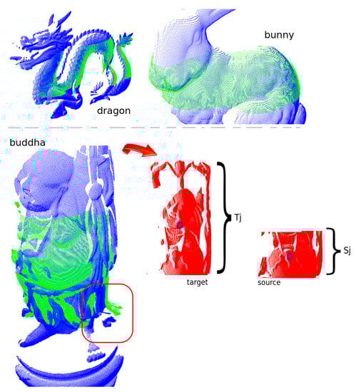 Finally, it should be emphasized that the registration vector (and, consequently, the rotation matrix) is obtained every time a pair of subclouds is subjected to matching, which is then extended to the full space of point clouds through the transformation of the input target cloud by the matrix and posterior quality checking of alignment to the source cloud. The misalignment between the target and source clouds is calculated and compared to , a threshold value that represents the stop criterion. The details of our proposition for such a threshold value are given next.