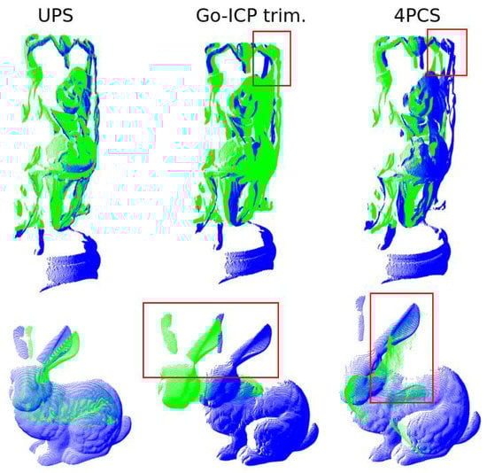 The problem of partial registration is an important issue in the field, and UPS was able to solve it to a good extent. In the literature, the existence of occlusion or self-occlusion has been approached in different ways, as stated in [], including the Four Point Congruent Sets (4PCS) [] and the recent proposition of Wang et al. [] provided important techniques to deal with that. In the investigation conducted here, 4PCS did not perform well (see Figure 12) and, in addition to that, it requires the use of an overlapping ratio parameter. Conerning the study presented by Wang et al. [] on partial registration, good results for the overlapping ratios of , and were reported. In our investigation of the overlapping ratio changing from to applied to the same models as in [], UPS also performed well. Moreover, in the present study, the more challenging situation of input clouds corresponding to shots acquired from different perspectives was considered.