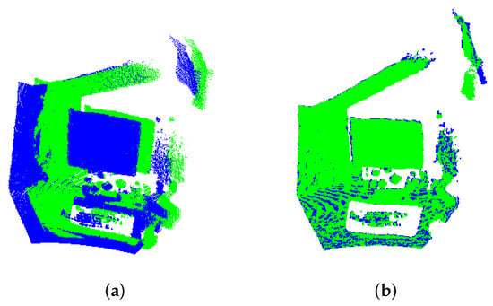 In addition, the Normal Distributions Transform (3D-NDT) [] is worthy of discussion because it makes tractable the problem of matching dense clouds and, in addition, it is a technique conceptually different to ICP; here, the scene is discretized into cells, each being modeled by a matrix representing the occurrence of linear, planar and spherical occupation of points, and then a nonlinear optimization strategy for cloud transformation is applied. However, this approach is rather time-consuming and unsuitable for low-performance hardware, as claimed by the authors in [].
