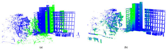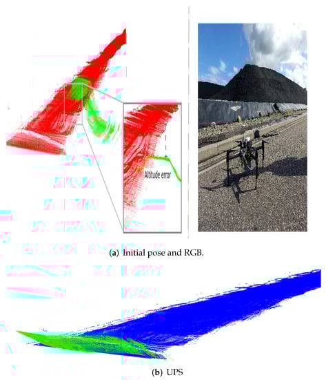 Concerning the registration of outdoor scenes, UPS performance was compared to usual choices for that scope, which includes ICP point-to-plane [], Generalized ICP [] and 3D-NDT []. These algorithms faced difficulties because the input models comprised unbalanced shots (with point clouds different in size). From a quantitative perspective, 3D-NDT showed limitations before the use of inputs from the UFC dataset, and the goodness of alignment as measured by RMSE was about 16.165 times worse than that achieved by UPS (see Table 12). Similar performance was found for Generalized ICP. Concerning elapsed time, UPS reached good registration sooner than 3D-NDT (4.205 times slower) and much sooner than Generalized ICP (48.946 times slower).