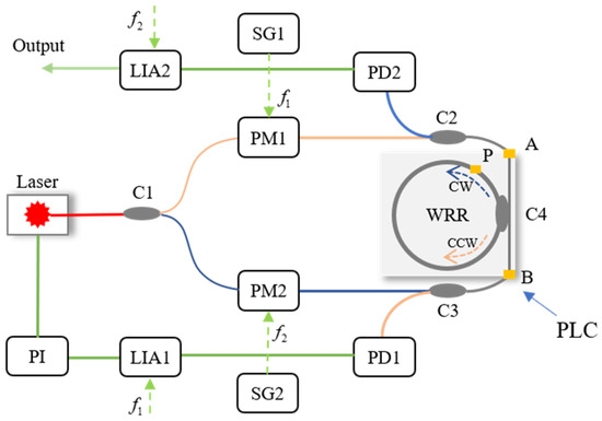 A basic signal detection system of the RIOG based on phase modulation technology is shown in Figure 1, including a laser, 3 dB couplers (C1, C2, C3), phase modulators (PM1, PM2), photodetectors (PD1, PD2), lock-in amplifiers (LIA1, LIA2), proportional-integral controllers (PI), and the WRR. Low-pressure chemical vapor deposition fabricates the WRR on a silicon planar light-wave circuit (PLC). The light source’s center wavelength is 1550 nm for the distributed feedback laser diode (DFB-LD). First, the PDs modulated the differential frequency of CW and CCW lights to eliminate backscattering noise. In order to reduce polarization noise, a polarization-maintaining silica PLC is used instead of the single-mode chip. The PLC includes two input and output directional couplers (C2 and C3) and a resonator coupler (C4). The coupling ratio of C1, C2, and C3 design couplers is 50%, and C4 is about 5%. It is optimized based on the total loss in the WRR, including propagation loss of WRR, excess loss caused by curvature, and excess loss through the coupler C4. Then, Sin waves with proper modulation frequencies (f1, f2) from signal generators SG1 and SG2 drive PM1 and PM2, respectively. The PD1 and PD2 detect the CW and CCW light from the resonator, respectively. The LIA1 receives the output of PD1 and feeds it back to the laser diode controller (LDC, inside the laser instrument) to lock the central frequency of DFB-LD at the resonant frequency of the CCW lightwave. The proportional-integral (PI) controller is inserted between LDC and LIA1 to reduce the error of the lock-in frequency. The readout of the rotation rate is the demodulated CW light-wave signal from LIA2.