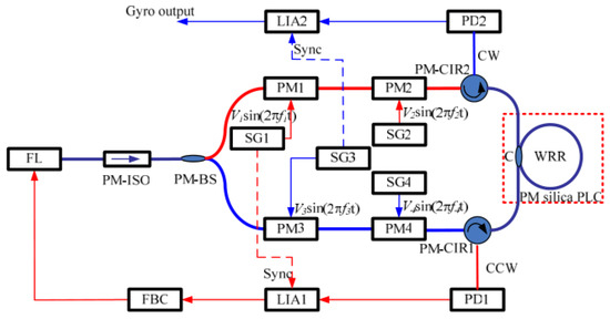 - Mao, H.; Ma, H.; Jin, Z. Polarization Maintaining Silica Waveguide Resonator Optic Gyro Using Double Phase Modulation Technique. Opt. Express 2011, 19, 4632–4643. [Google Scholar] [CrossRef] [PubMed]