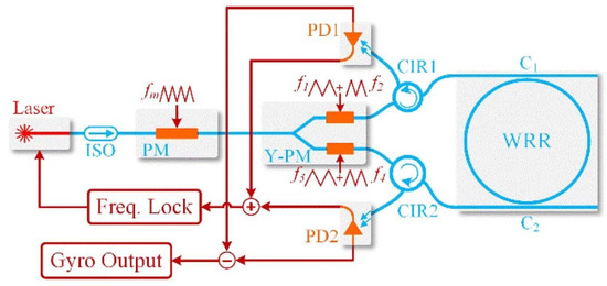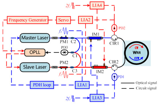 Niu et al. proposed a suppression approach based on double light sources [22], in which light for CW and CCW is provided by two tunable semiconductor lasers, respectively, as shown in Figure 6. Optical Phase-Locked Loops (OPLL) lock the operating frequencies of the two separate lasers to the WRR’s CW and CCW resonant frequencies. High-frequency noise induced by interference (see Equations (1) and (2)) between the backscattering light and the signal light can be eliminated in this manner. Adjusting the OPLL bandwidth lowered the frequency noise for double lasers as well. Then, intensity modulators with second harmonic feedback were used to stabilize the optical power in the cavity. Compared with the SPMT in a single-laser system, the impact of interference light was decreased by order of magnitude, and the bias stability was 0.00448°/s of a 5 s integration time.