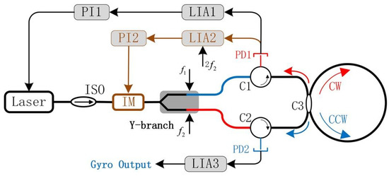 Niu et al. proposed a method to suppress backscattering noise and Kerr noise in a RIOG [36], as shown in Figure 13. It employs two independent lasers to lock the CW and CCW optical signals at different frequencies, effectively suppressing backscattering noise and resulting in a differential output. Simultaneously, a light intensity feedback loop based on a light intensity modulator is added to the loop to ensure consistent optical power to reduce Kerr noise. The light intensity fluctuation decreased by two orders of magnitude, and the gyro’s bias stability was increased to 9.06°/h.