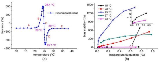Experimental findings of (a) bias error of the RIOG in different temperatures and (b) bias stability of the RIOG in different temperature fluctuations. Reprinted with permission from ref. [43]. Copyright 2012 IEEE.