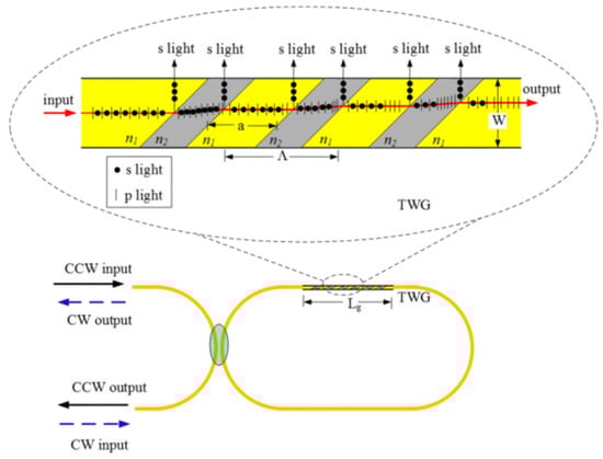 Improving the WRR’s polarization extinction ratio (PER) is an appealing alternative method. The in-cavity and out-cavity methods are two methods for improving the WRR’s PER [85]. As shown in Figure 15, the tilted waveguide gratings (TWGs) with Brewster’s angle were presented for the silica WRR [46], which is an in-cavity method with the most perceptible improvement [50]. The in-cavity PER can reach 40 dB by adding a 4 cm-long 45° tilted grating to the original WRR and using the best structure parameters. However, the fabricated process is not mature at present [48].