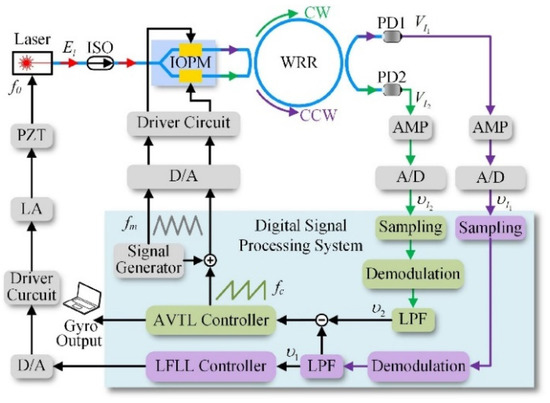 - Ma, H.; Wang, W.; Ren, Y.; Jin, Z. Low-Noise Low-Delay Digital Signal Processor for Resonant Micro Optic Gyro. IEEE Photonics Technol. Lett. 2013, 25, 198–201. [Google Scholar] [CrossRef]