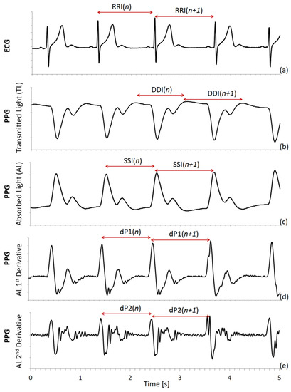 SSI, which is the peak-to-peak interval, is a commonly used PPG tachogram because it is defined similarly to RRI. DDI has been also proposed to measure the distance between consecutive feet of the pulse waves and is also called valley-to-valley or foot-to-foot interval [15,21,22]. The dP2 fiducial point is intended to identify the foot of the wave more precisely as the instant when the blood volume starts to rise after the heart contraction. The dP1 point is where the pulse wave upstroke is most rapid. Figure 2 shows an example of the beat-to-beat intervals derived from the ECG and PPG.