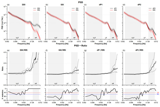HRV power spectra density (PSD) sleeping at high altitude. Upper panels: geometric mean (solid line) ± geometric standard error (dotted line) for PSD calculated from DDI (a), SSI (b), dP1 (c), and dP2 (d) tachograms (black) and the reference RRI (red) over N = 21 participants. Lower panels: spectral ratios between DDI (e), SSI (f), dP1 (g), and dP2 (h) tachograms and the reference tachogram: median (solid line) with 1st and 3rd quartiles (dotted line) and V-statistics of Wilcoxon rank test; at frequencies where the V-value is above the 5% (or 1%) significance threshold (dashed horizontal line) the spectral ratio differs from 1 at the 5% (or 1%) statistical significance. Grey/white areas indicate the frequency bands for evaluating VLF, LF, and HF powers.