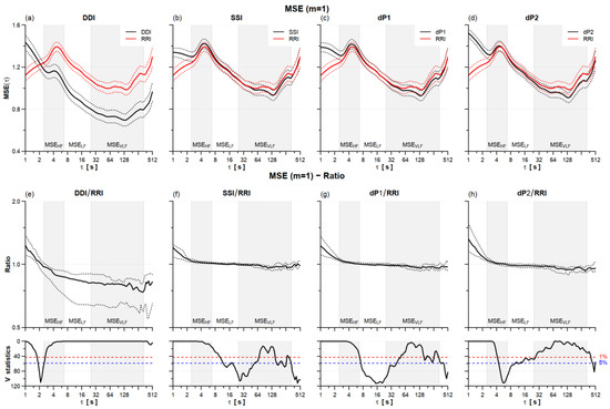 HRV multiscale entropy (MSE) for m = 2 sleeping at high altitude. Upper panels: mean (solid line) ± standard error (dotted line) for MSE of DDI, SSI, dP1, and dP2 (black) and the RRI reference (red) on N = 21 participants (panels (a–d)). Lower panels: MSE ratio between DDI (e), SSI (f), dP1 (g), and dP2 (h) tachograms and the RRI reference: median (solid line) with 1st and 3rd quartiles (dotted line) and V-statistics of the Wilcoxon’s rank test; at the scales where V is above the 5% (or 1%) significance threshold (dashed horizontal line) the ratio differs from 1 at the 5% (or 1%) statistical significance. Grey/white areas indicate the scales for evaluating MSEHF, MSELF and MSEVLF.