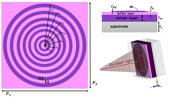 As illustrated in Figure 1, the designed SDS BEA-style microstructure consists of a layer of RR semiconductor antennas, which are placed in a bull’s eye aperture shape, and a mirror layer, separated by a magnesium fluoride () dielectric material as a buffer layer which works as a dielectric spacer. We used a semiconductor thick film with a thickness of () 20 µm and the () 2 µm thickness of the semiconductor RRs (see Table 1).