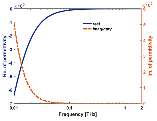 where, is the relative permittivity, is the real, and the imaginary, parts of the relative permittivity, respectively, which plotted in Figure 2 and can be calculated as: