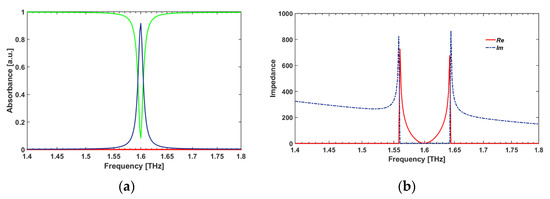 The simulated spectral responses and the real and imaginary parts of the impedance as a function of frequency for unit cell A case are calculated and plotted (see Figure 3). As can be seen in Figure 3b, when the real part of the effective impedance is nearly one (i.e., = 1.811) and the imaginary is exactly zero (i.e., = 0) at a frequency of peak absorption resonance of = 1.6 THz, the reflection value decreases to zero (R(ω ≃ 0); so, the absorbance will close to one ( = 0.9167), which means the effective impedances are nearly matched to the free space (see Figure 3).
