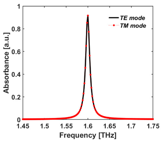 This work started with the simulation of unit cell A that operates as a single-band THz absorber comprised of only one RR antenna SDS sandwiched layer, which shows one strong absorption peak in the THz frequency range at = 1.6 THz (Figure 4 and Figure 5a). Moreover, we investigated the polarization-independent characteristic of the proposed design in Figure 4. As can be seen in Figure 4, there are no differences between the absorbance spectra in TE and TM polarization modes. Therefore, it can be concluded that our proposed design is a polarization-independent structure.