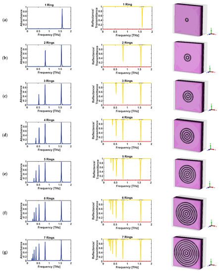 The concept of a metasurface THz absorber is particularly important at THz frequencies where it is difficult to find strong-frequency-selective THz absorbers. The single-band THz absorbers are valuable, but it is anticipated that they have some limitations in applications from the frequency selectivity aspect [4,7]. Therefore, to prevent these potential limitations, a multi-band design of the metasurface is urgently needed. However, in the fields of opto-electronics, THz communication systems [84], and photonics, it is necessary to obtain more information through multi-band and multi-beam means to develop multi-tasking systems, which produce potential applications for multi-band THz absorbers [85,86]. Therefore, we designed the second microstructure, defined as unit cell B, with two RR antennas which work as a dual-band THz absorber. As seen in row (b) of Figure 5, there are two absorption peaks in the blue-line curve (corresponding to the two dip resonances in the reflectance spectrum in the yellow-line curve) in the absorbance spectrum; one is perfect, with approximately 98.85% absorptivity at a frequency of 1.564 THz, and the second occurs at approximately 0.824 THz with approximately 74.64% absorptivity. In this way, the next proposed microstructures, called “unit cell C/D/E/F/G”, with three/four/five/six/seven RR antennas, respectively, were designed and simulated. As can be seen from row (g) of Figure 5, there are seven absorption peaks, and six of them are placed at the sub-THz band (under 1 THz frequency range) which is so valuable in opto-electronics technology and THz communication system applications. To have an N-band THz absorber with peak absorption in the sub-THz band regime, the designed microstructure should have N-ring resonators such as in the proposed design.